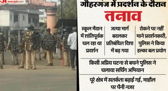 गौहरगंज में चल रहे प्रदर्शन के दौरान स्थिति कुछ देर के लिए तनावपूर्ण हो गई। जानकारी के अनुसार, पहले प्रदर्शन स्कूल मैदान में शांतिपूर्वक जारी था, लेकिन इसी बीच भीड़ में मौजूद एक जत्था मार्ग बदलकर प्रतिबंधित क्षेत्र की ओर बढ़ गया। पुलिस द्वारा रोकने पर युवक नहीं माने, जिसके बाद उन्हें हटाने के लिए पुलिस ने हल्का बल प्रयोग किया। इसके बाद एहतियातन पुलिस ने आसपास के इलाकों में सर्चिंग अभियान शुरू किया, ताकि किसी भी तरह की अप्रिय स्थिति न बन सके।